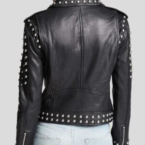Black Leather Biker Jacket Adorned With Gold Studs for Women