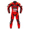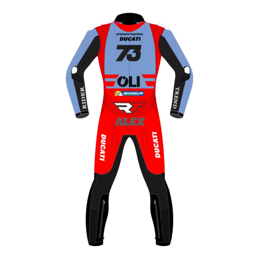 The suit showcases a striking design, reflecting the Gresini Racing Team’s colors and Ducati’s iconic style. Predominantly adorned in the classic red, white, and blue, it features dynamic graphics and branding that highlight the collaboration between Gresini Racing and Ducati. The bold aesthetic is not just about looks; it’s engineered to provide visibility and a sleek aerodynamic profile on the track.