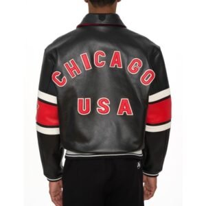 Limited Edition: Avirex Chicago USA leather jacket black & red in 100% antique European lamb leather with Chicago, IL art patch set and applique lining art. Wide stripe detailing on sleeves.