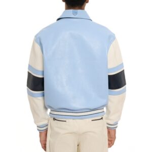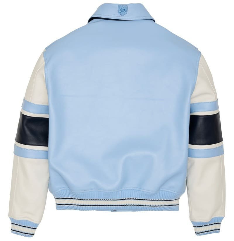 Avirex Legend Leather Jacket Blue in 100% antique European lamb leather with Avirex goaler art patch set and applique lining art. Wide stripe detailing on sleeves.