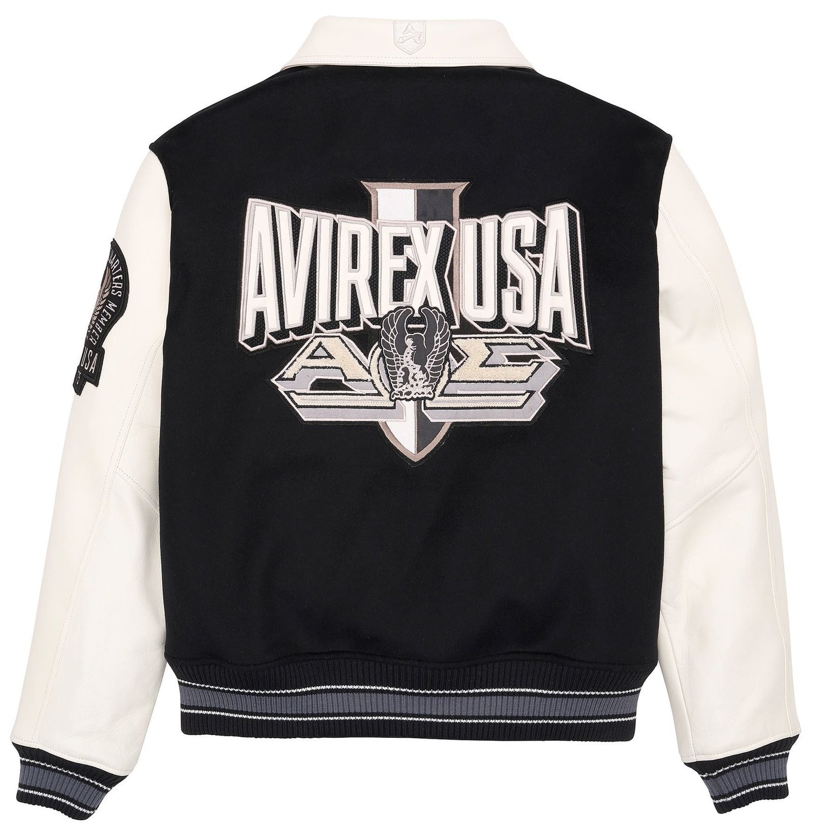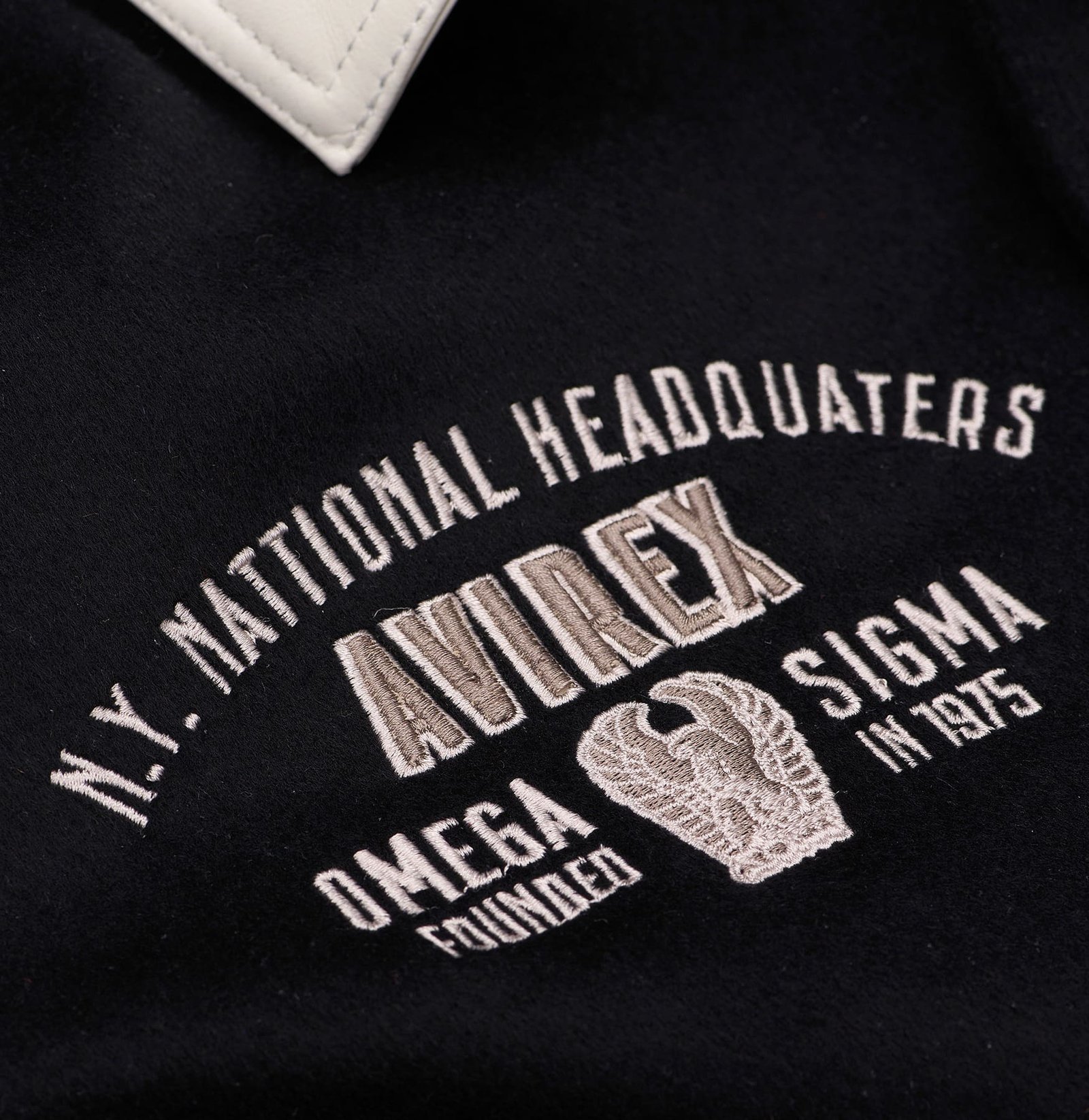 Avirex Omega Wool Leather Jacket with antique European lamb leather sleeves and merino wool body. Designed with chenille omega signa and Avirex patch art and textured hockey art embroidery.