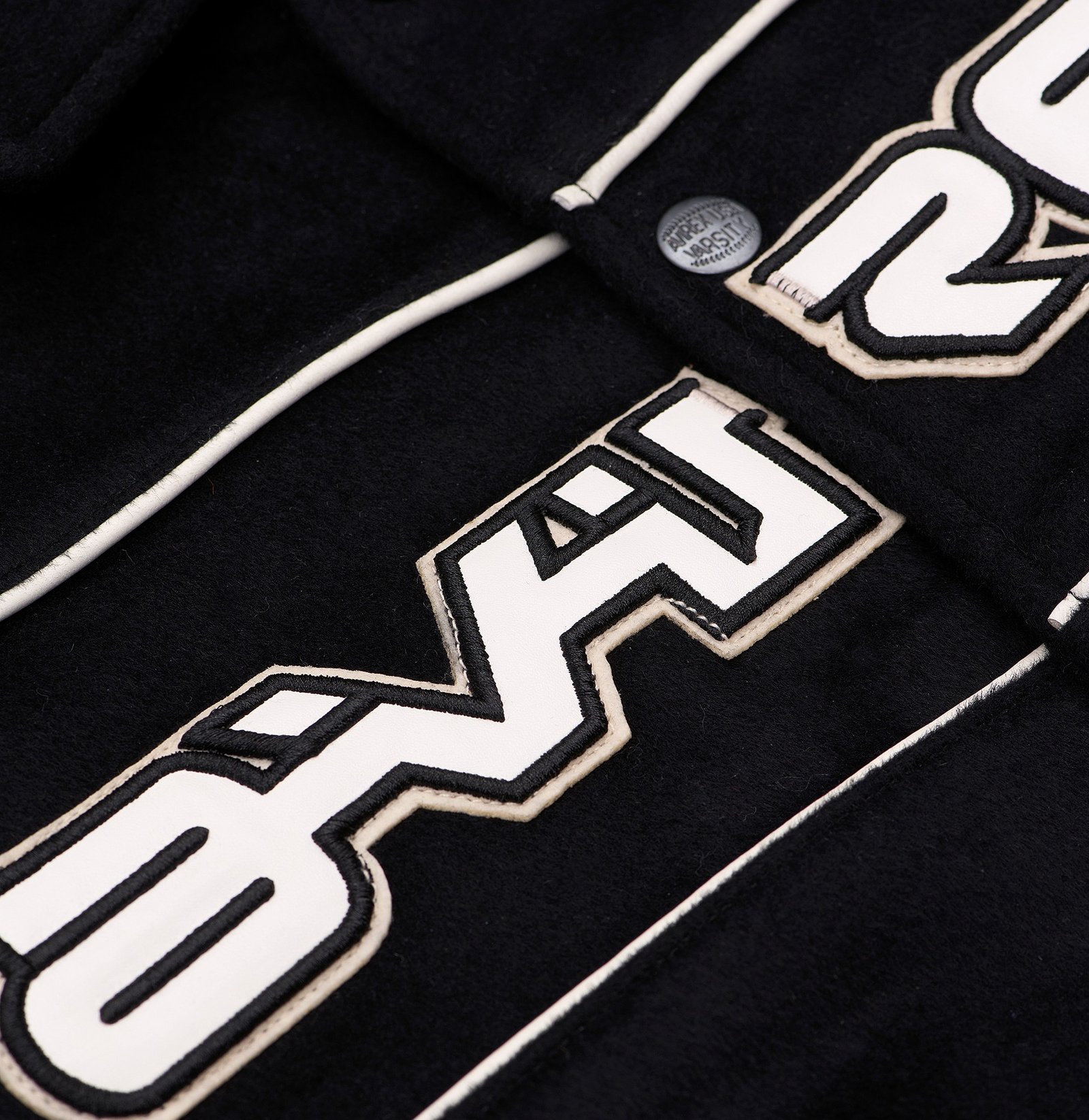 Avirex Woolrider jacket Black & White with contrast leather piping across the shoulders and down the sleeves. Avirex signature embroidery across the chest.