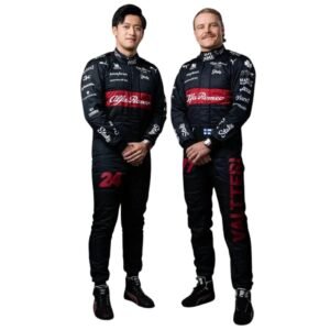 Aesthetically, the FR1 Alfa Romeo suit showcases a bold, dynamic design with vivid prints that reflect Alfa Romeo’s racing spirit. The prominent Alfa Romeo logo and distinctive racing graphics are emblazoned across the suit, making it a standout piece on the track. The color scheme typically combines classic racing hues with modern accents, creating a visually striking appearance that exudes both speed and sophistication.