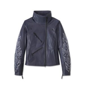Functionality meets style with thoughtful details such as multiple zippered pockets for secure storage of essentials, adjustable waist straps for a customized fit, and zippered cuffs that not only enhance comfort but also streamline the jacket’s silhouette. The asymmetrical front zipper closure adds a touch of edge, echoing the iconic biker jacket aesthetic. HARLEY WOMEN’S BRAZEN LEATHER BIKER LEATHER JACKET