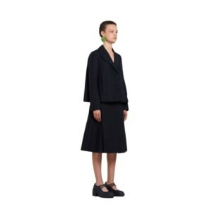 The Marni Black A-Line Cady Jacket is designed with a clean, minimalist front, featuring a subtle, concealed button closure that maintains the jacket’s sleek profile. The notched lapels add a touch of traditional tailoring, while the lack of excessive embellishments ensures a timeless, versatile look.