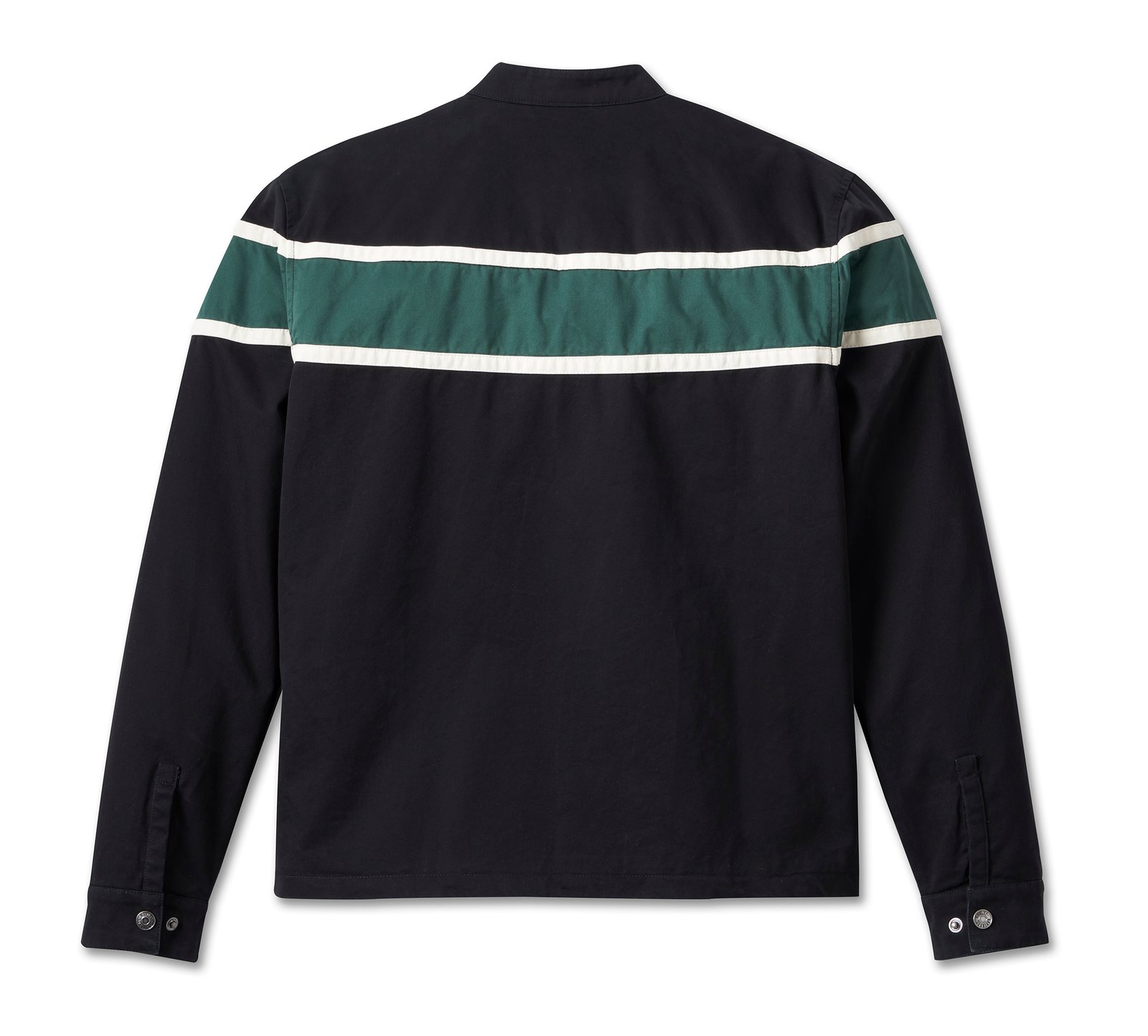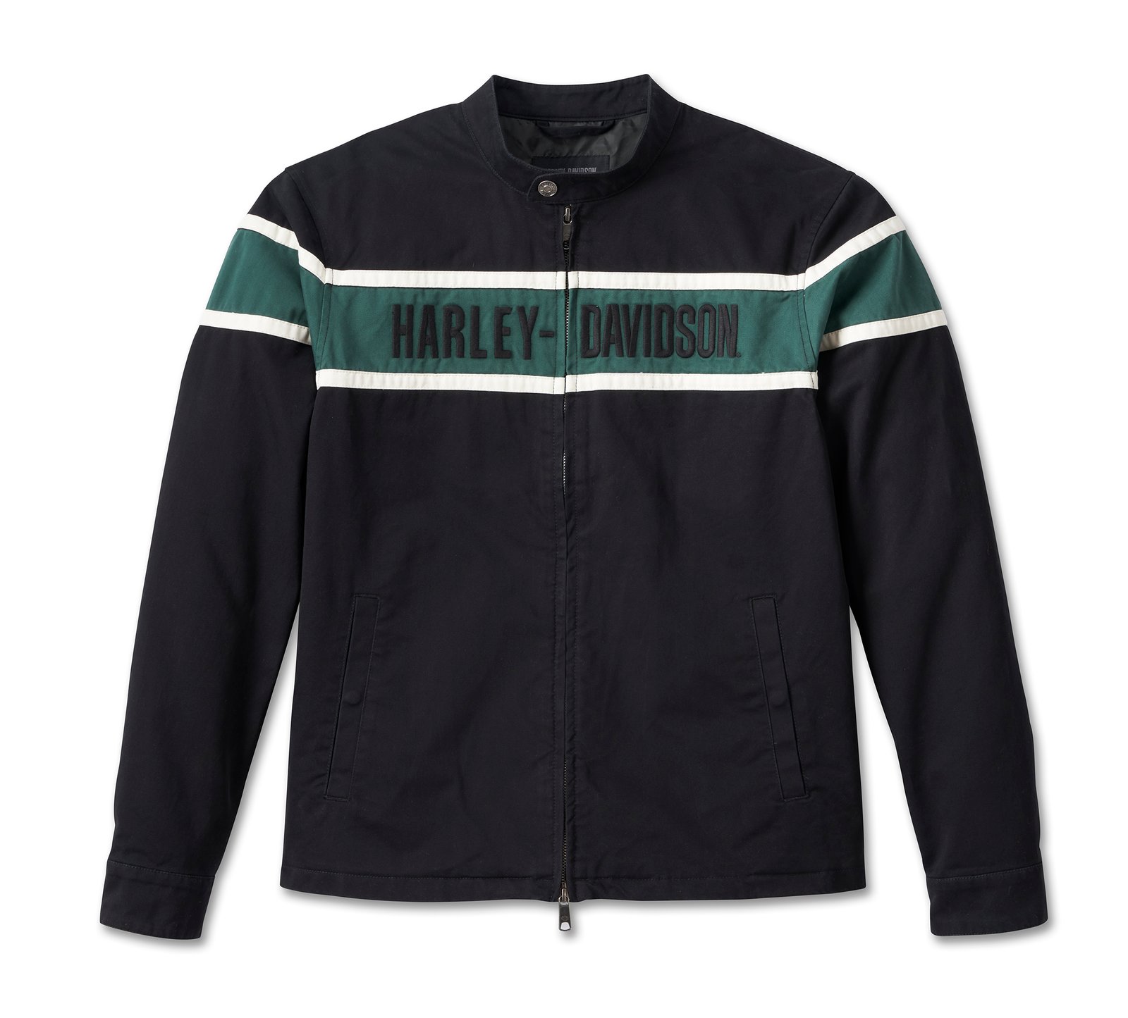 Elevated style gets a hit of Harley pride in our Limited Edition Men’s Bar Jacket. Cut from rugged cotton twill that’s washed for a soft, well-worn feel with a smooth polyester taffeta lining. It earns style points for its classic silhouette and contrast piecing with a pop of green to welcome spring. Our namesake is proudly embroidered on front for an all-in Harley-Davidson® look. Hurry since this fresh, seasonal men’s jacket is only around while supplies last.