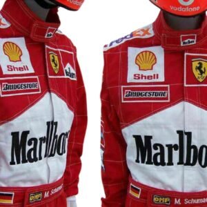 Constructed from high-quality materials, the suit mirrors the design and color scheme of the original worn by Schumacher during his championship-winning season. The sleek, aerodynamic design is not only visually striking but also reflects the cutting-edge technology and precision engineering that define Formula 2 racing. The suit features Schumacher’s team livery, including vibrant sponsor logos and distinctive color accents that capture the essence of his racing persona.