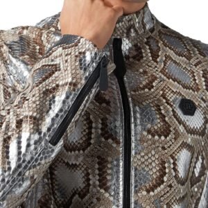 The Philipp Plein Python Leather Moto Jacket is crafted from 100% python leather, with a luxurious 100% cupro lining, Philipp Plein Leather Bomber Jeffrey epitomizes exquisite craftsmanship and superior quality. Adorned by a model standing at 188cm/6’2″ wearing a size M, each piece from Philipp Plein’s collection ensures authenticity and excellence, available exclusively on the official online store.