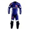 The suit is adorned with the iconic Suzuki GSX-R logos and graphics, giving it a distinctive look that stands out on the track. It features a vibrant color scheme, typically in the brand’s signature blue, white, and black, which not only enhances its aesthetic appeal but also improves visibility. The design includes strategically placed perforations and vents to ensure optimal airflow, keeping the rider cool and comfortable during intense rides.