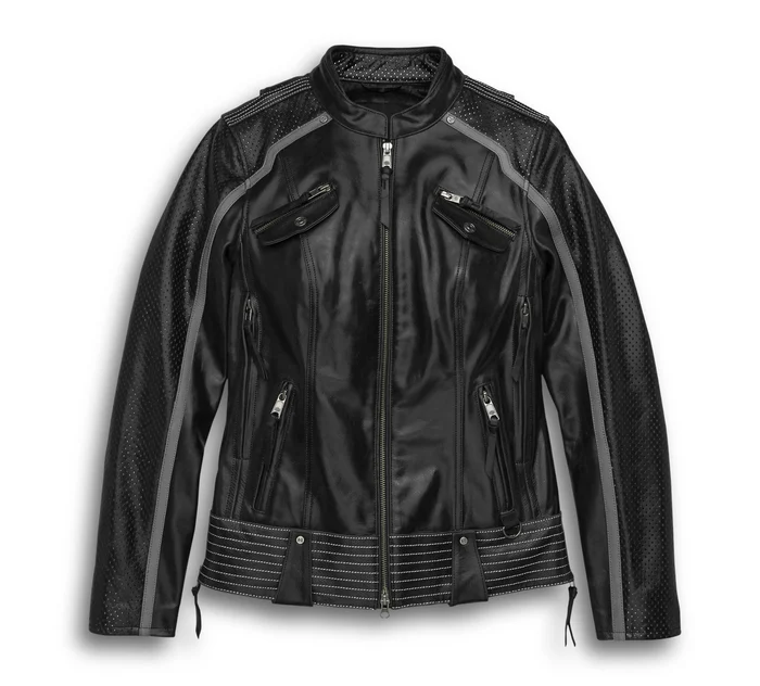 The Women’s Hairpin Leather Jacket combines functionality with a striking aesthetic. Decorative perforated leather accents with contrasting white underlay add texture and visual interest. Appliqué graphics further elevate the jacket’s design, making it a head-turner on and off the bike.