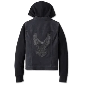 This rockin’ rider look is a triple play of style, comfort, and versatility. Our Limited Edition Kickstart 3-in-1 Black Denim Jacket features an all-cotton denim vest plus a cozy cotton/poly fleece hoodie, both enzyme washed for a well-worn vibe. The vest is a classic trucker silhouette with sturdy pockets and hidden snap-down collar that stays put during rides. Wear the vest alone with other H-D® layers, the hoodie alone over tanks and tees, or both together to complete this look.