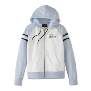 Bold, race-inspired comfort is what our Special Liberty Zip Front Hoodie is all about. Crafted from a cotton and polyester French terry blend that’s vintage washed for a well-worn look and feel. This women’s hoodie sports roomy kangaroo pockets, a jersey-lined drawstring hood, and rib-knit trim to keep its shape. Its style is accelerated by details like raglan sleeves, contrast piecing, and sleeve striping. Our namesake graces the front and goes all-in on back for a winning Harley-Davidson® look. Know the history—our #1 Logo featured here debuted in 1969 to mark our AMA Grand National Championship season title.