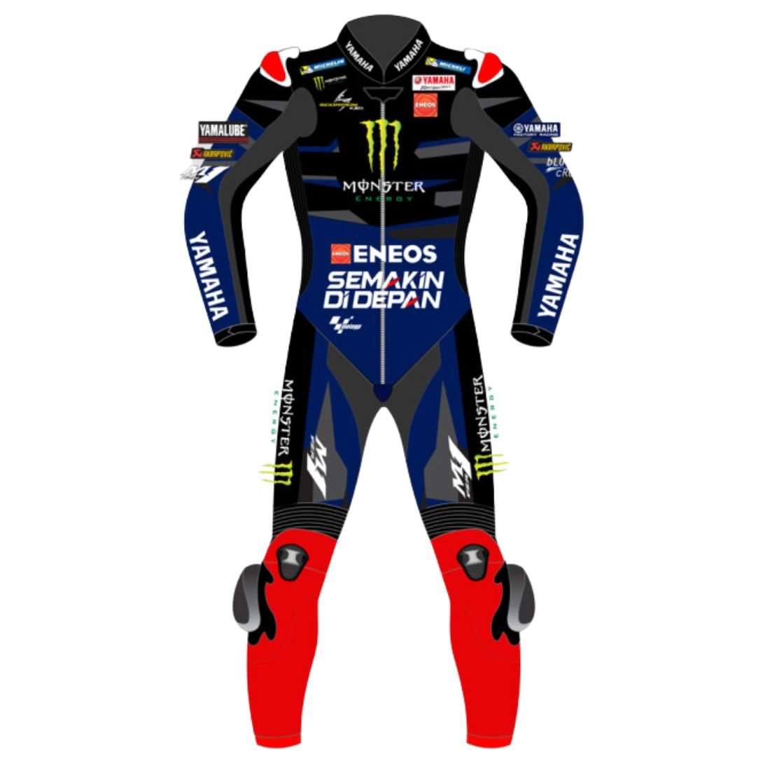 Experience the thrill of MotoGP with the YAMAHA Fabio Quartararo MotoGP Monster Energy Leather Suit, a top-of-the-line racing suit designed to embody the dynamic style and performance of one of the sport’s most electrifying riders. Crafted from high-quality full-grain leather, this suit offers exceptional durability and abrasion resistance, making it perfect for both track and road use. Adorned with the distinctive Monster Energy and Yamaha Racing Team colors, along with Fabio Quartararo’s signature graphics, this suit not only delivers superior performance but also showcases your allegiance to one of MotoGP’s rising stars.